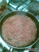 Немного все это протушив, добавляем ложку томата, сахар, соль и разбавляем всю эту красоту бульоном, в котором тушились наши рёбрышки! Еще минутку тушим.