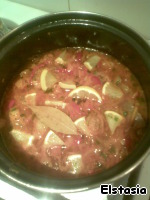 Затем заливаем соусом ребрышки с мяском, добавляем лимончик (разрезаем дольки на сегменты), перец горошком и лавровый листик. Всю эту красоту тушим еще минут 20. Всё, готово.