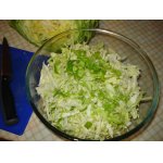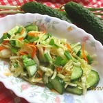 Капусту нашинковать, морковь натереть на крупной тёрке. Добавить соль, сахар, чёрный молотый перец, уксус, разведённый в холодной кипячёной воде, соевый соус и кориандр.