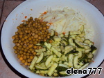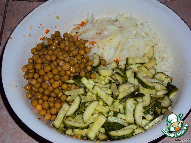 Затем добавить горошек, порезанные соломкой лук и огурцы.