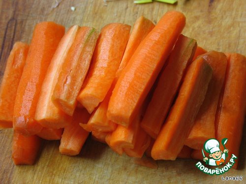 Когда мясо практически сварится, добавляю крупно нарезанную на брусочки морковь (если есть репа и горох нут, можно тоже добавить. Шурпа становится еще вкуснее и насыщеннее, только горох должен быть заранее замочен).