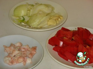 Для поджарки нарезать бараний жир кубиками, лук полукольцами, помидоры крупными дольками, чеснок.