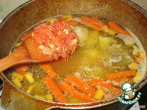 Если в бульоне все сварилось до мягкого состояния бросаем картофель и варим его до полуготовности. -
