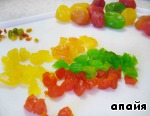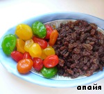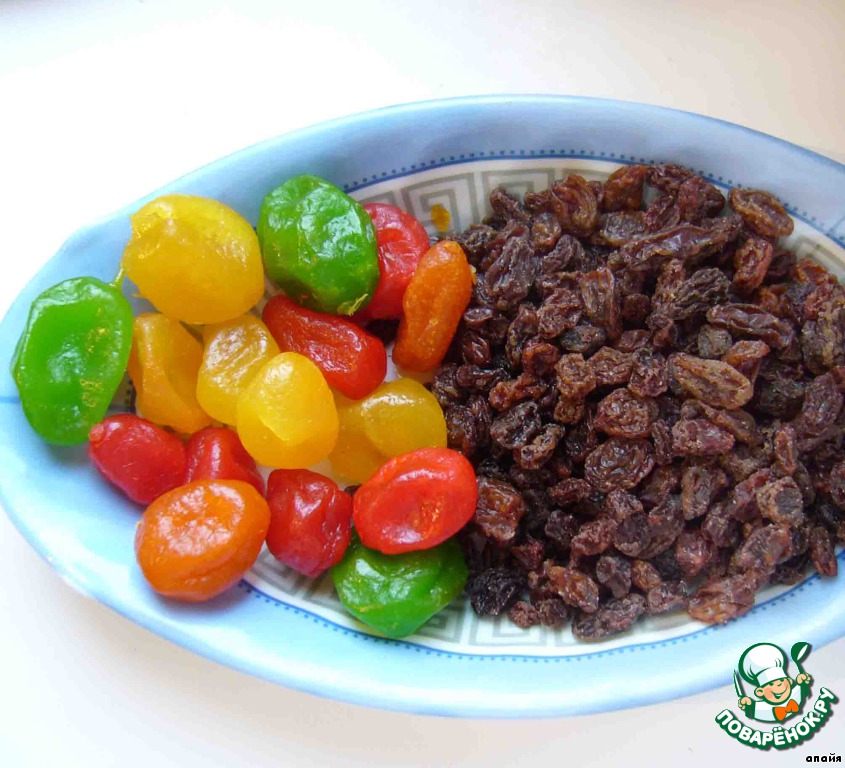 Засыпать изюм и мелко нарезанный кумкват. Все хорошенько размешать. Массу смешать с мукой и дать ей постоять 10-15 минут.
