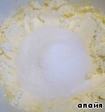 Добавить сахар, ванильный сахар и соду (не гашенную). Все тщательно перемешать.