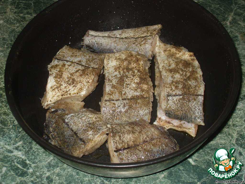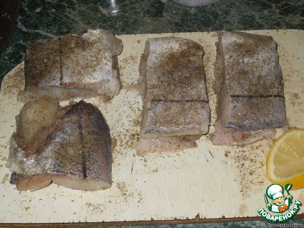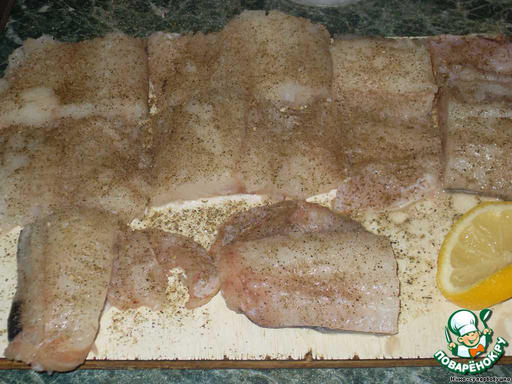 Кусочки филе посыпать приправой для рыбы, солью и перцем, сбрызнуть лимонным соком.
