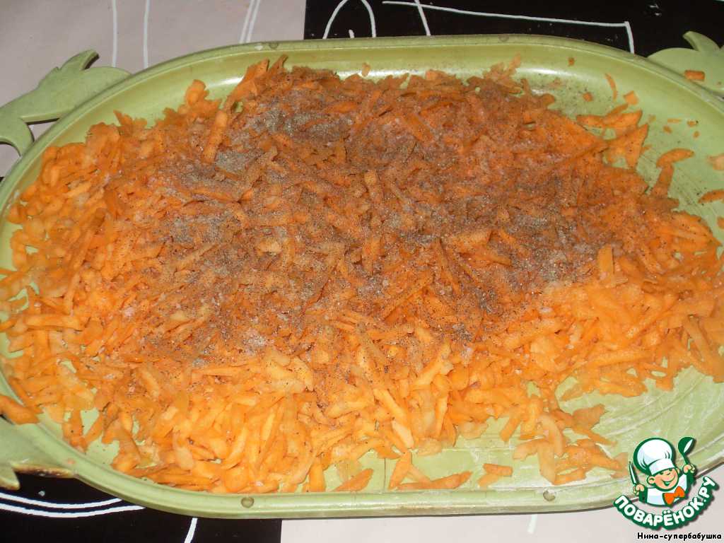 Морковь очистить и натереть на крупной терке. Слегка присолить и поперчить.