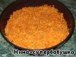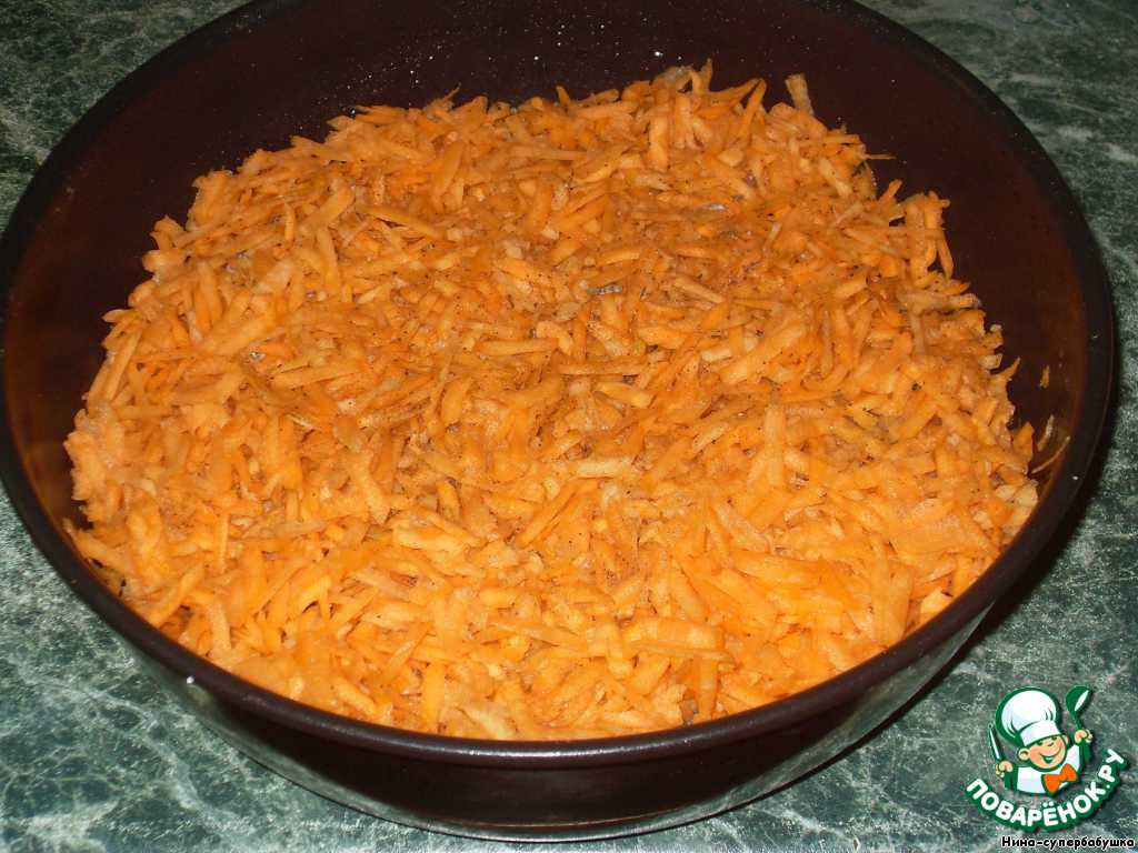 Выложить морковь на рыбу и разровнять. Слой моркови должен быть таким, чтобы рыбы не было видно.