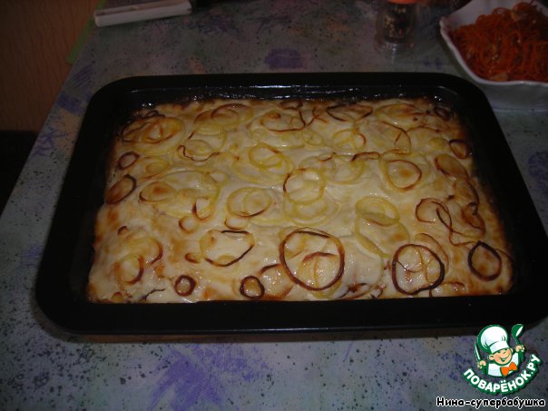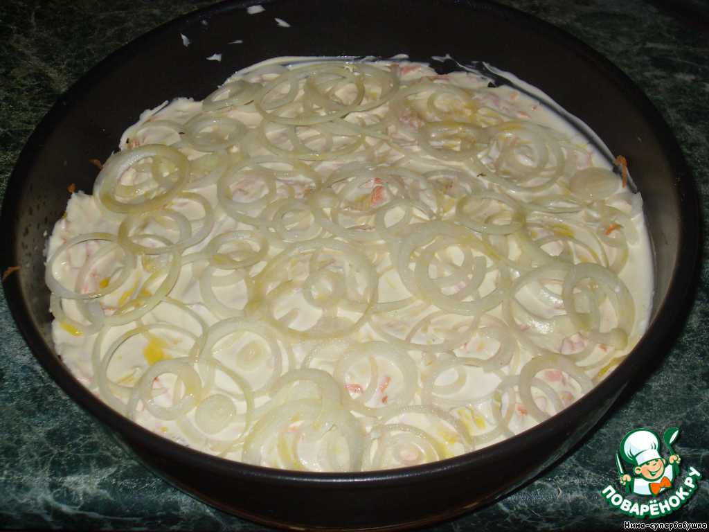 Сверху выложить лук, нарезанный кольцами, слегка притопить его в майонезе и смазать кисточкой растительным маслом.