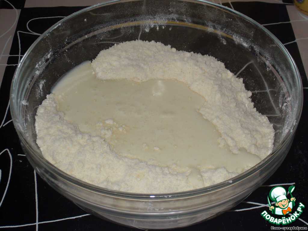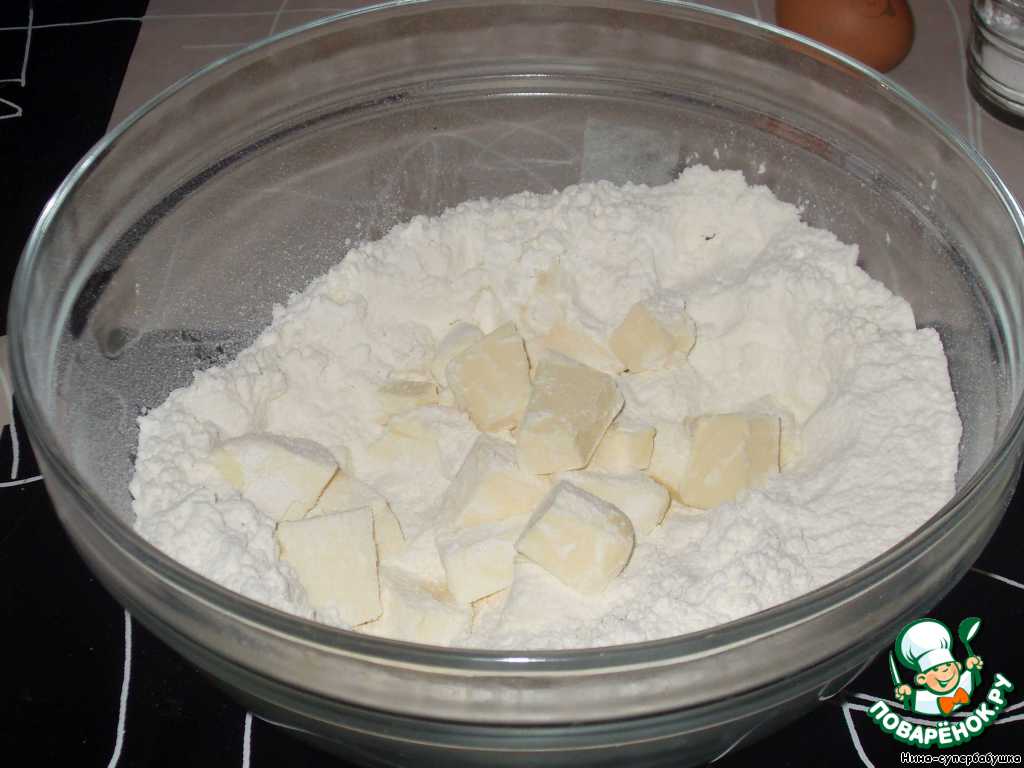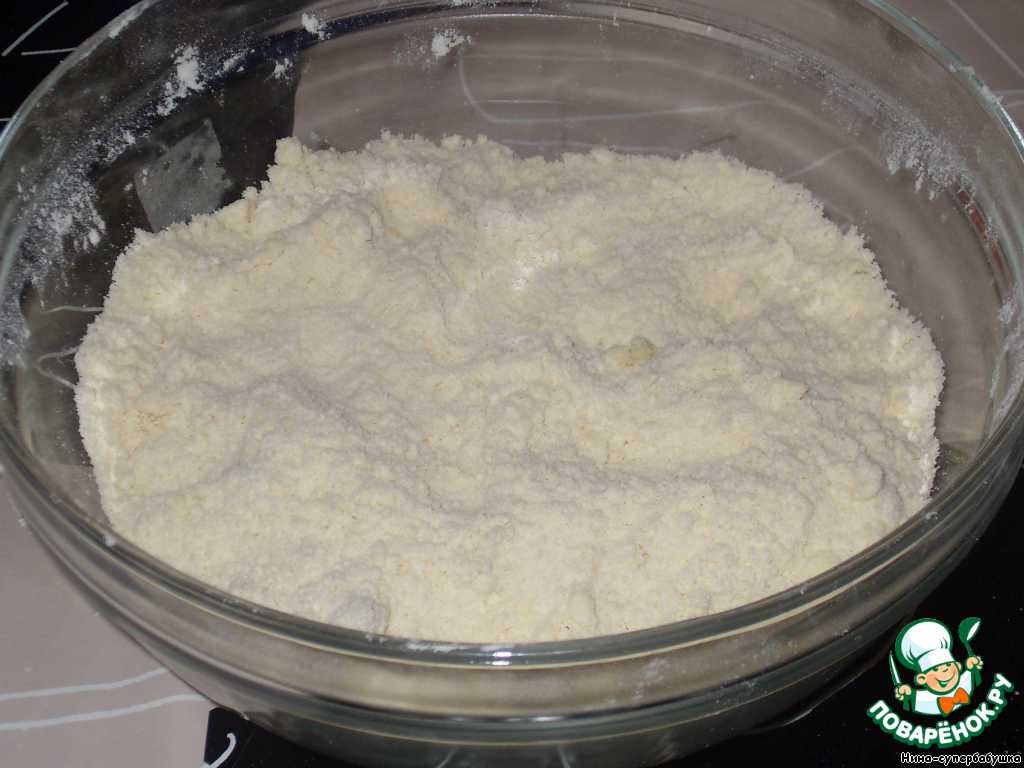 Муку просеять вместе с содой и разрыхлителем. Добавить нарезанное небольшими кусочками охлажденное масло