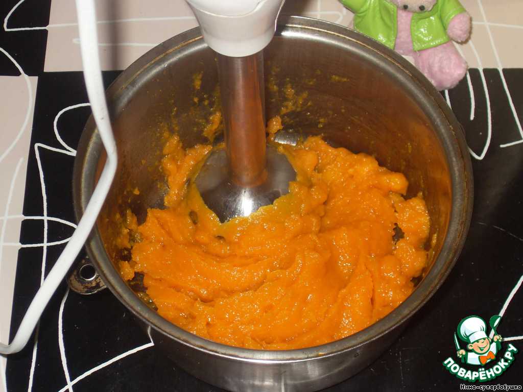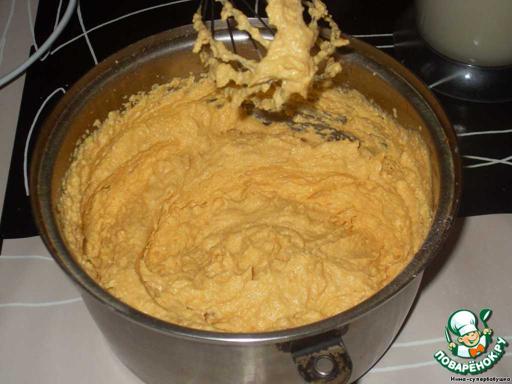 Вмешать полученную смесь в тыквенное пюре, ввести масло комнатной температуры и все вместе хорошо взбить. Начинка получается жидкой.