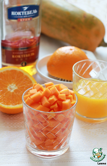 Очищенный кусочек тыквы режем на небольшие кубики. Дальше, если у Вас есть апельсиновый ликер, просто залейте им тыкву и дайте постоять часок. Но у меня не было ликера, пришлось его изобретать. Из половинки апельсина выдавливаем сок, добавляем к нему немного водки, коньяка и пару чайных ложечек сахара.