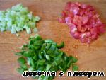 Помидор, огурец и болгарский перец нарезать кубиками.