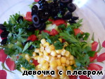 Маслины нарезать кружочками. Смешать нарезанные помидор, огурец, болгарский перец, маслины. Добавить рубленную зелень и кукурузу.