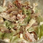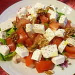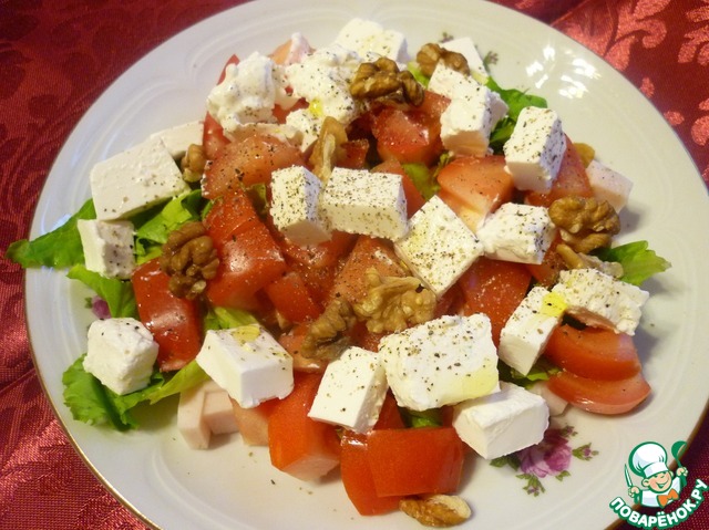 Забыла добавить листья салата, поэтому украсила ими салат сверху. Посыпала грецкими орешками. Вот и готов наш "Блиц-салат".
