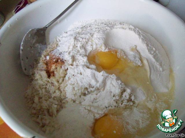 К потёртой массе добавляем стакан кефира, в котором предварительно растворили 0.5 чайной ложки пищевой соды (осторожно (!!!), когда в кефир добавите соду, он начнёт пениться и увеличится в объёме), щепотку соли, можно приправ, которые Вы любите, стакан муки (просеянной на мелком сите) и два яйца.