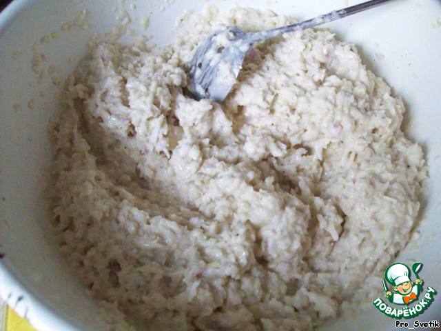 • К потёртой массе добавляем стакан кефира, в котором предварительно растворили 0.5 чайной ложки пищевой соды (осторожно (!!!), когда в кефир добавите соду, он начнёт пениться и увеличится в объёме), щепотку соли, можно приправ, которые Вы любите, стакан муки (просеянной на мелком сите) и два яйца.