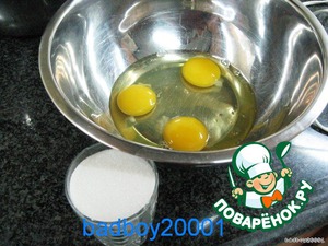 Tри яйца комнатной температуры с 150 граммами сахара..
