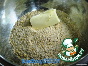 Смолоть в крошку и добавить 50-60 грамм мягкого масла (в комбайне можно смолоть вместе с замороженым кусочком масла, тот же эффект).