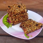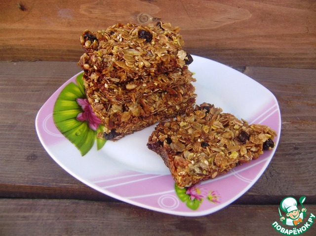 Орехи подробить (крупно), смешать с семечками, изюмом, кунжутом и кокосовой стружкой. Добавить овсянку. |