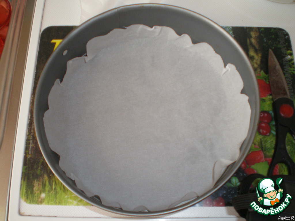 В форму на дно вырежьте из пергаментной бумаги кружочек, чуть больше диаметра формы. Не поленитесь это сделать! Очень оцените, когда будете перекладывать пирог на блюдо!