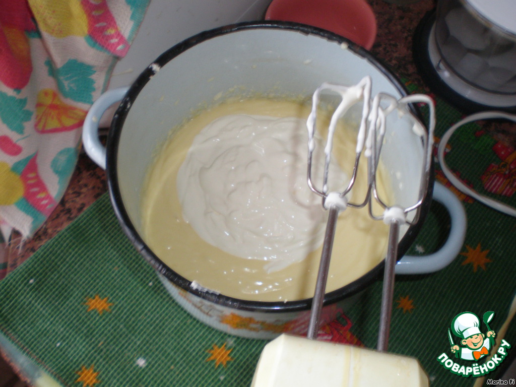 Теперь займемся начинкой. Крем-чиз (это может быть и настоящий маскарпоне по 250 руб. за 200 г, и янтарь плавленый в баночках по 11 руб. за 100 г, - все вкусно! Я три года делала с янтарем, теперь, благодаря "Поваренку", делаю маскарпоне сама, получается не хуже, а скорее намного лучше (в смысле для чизкейка). Дай Бог здоровья авторам рецептов маскарпоне на этом сайте и большое спасибо! Итак, крем-чиз взбиваем миксером с сахаром около 2-х минут, пока масса не станет достаточно гладкой.