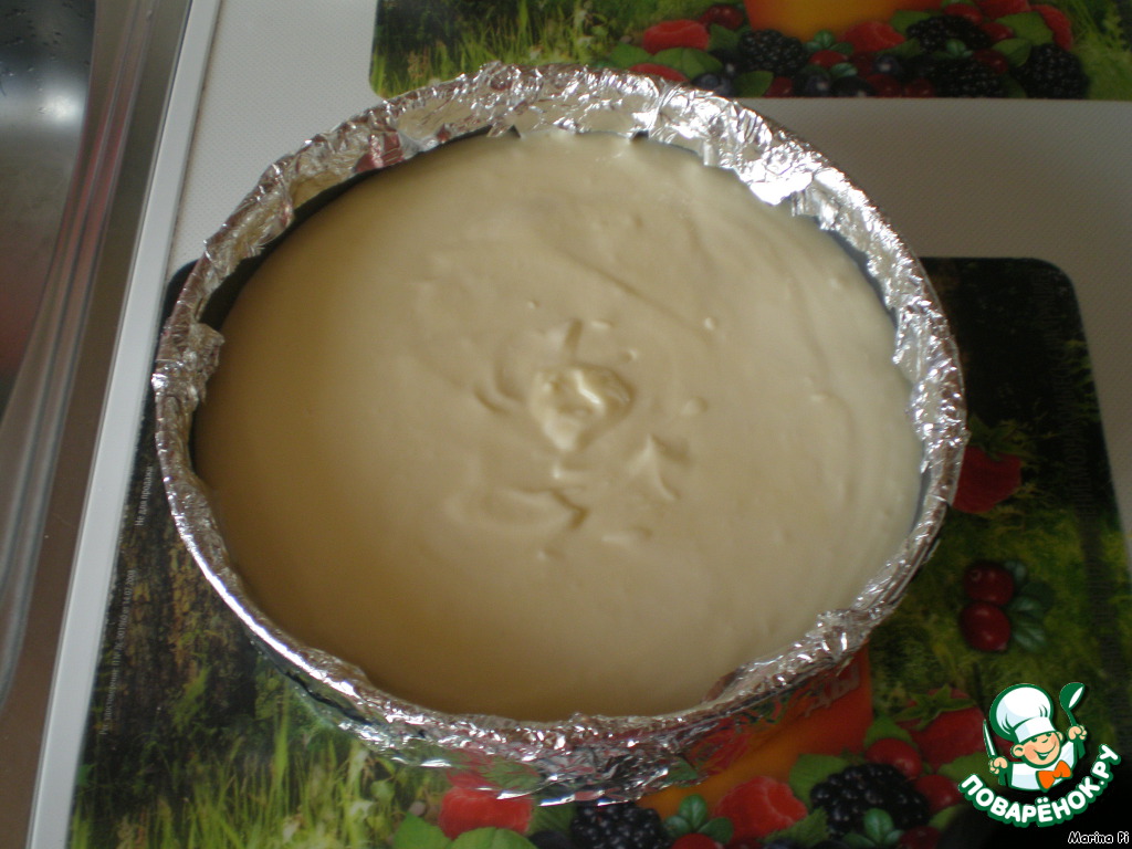 Достаем форму с коржом из холодильника и тщательно оборачиваем фольгой, можно даже в два слоя.