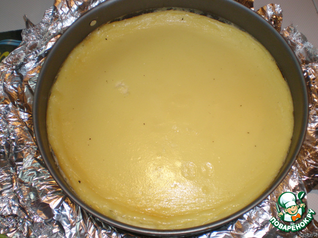 Выливаем нашу начинку в форму с коржом, придумываем водяную баню, куда сможет поместиться наша форма, у меня глубокий протвень в духовке, куда наливается вода и устанавливается форма с чизкейком.