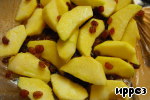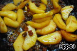Добавить в сковороду изюм с ромом, осторожно перемешать с яблоками и подержать на среднем огне в течение 3-4 минут. -