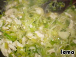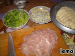• Для приготовления начинки потушить с добавлением маргарина нашинкованный лук-порей и порезанное тонкими полосками куриное мясо. Посолить по вкусу с учётом того, что сыр с плесенью солёный.