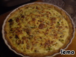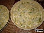 • Распределить тесто равномерно по дну и стенкам формы, смазывать не надо. Положить начинку и покрыть её смесью двух сыров. Залить сливками или молоком, смешанным со взбитым яйцом.