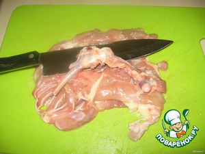 Переворачиваем окорочок и удаляем трубчатые косточки, делая надрез над ними.