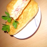 Положить в серединку начинку (тертый сыр и ветчину) -