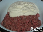 Соединить мясной фарш и творожную смесь, посолить, поперчить, перемешать.