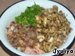 Добавить в фарш лук, грибы, зелень, перемешать