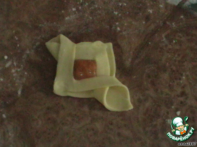Кладем в центр каждого квадратика яблочко и несколько штучек изюма. Соединяем концы теста.