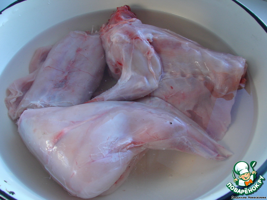 • Тушку кролика разделить на части, залить холодной водой, добавить немного уксуса, чтобы была легкая кислинка, и оставить часа на 2-3.