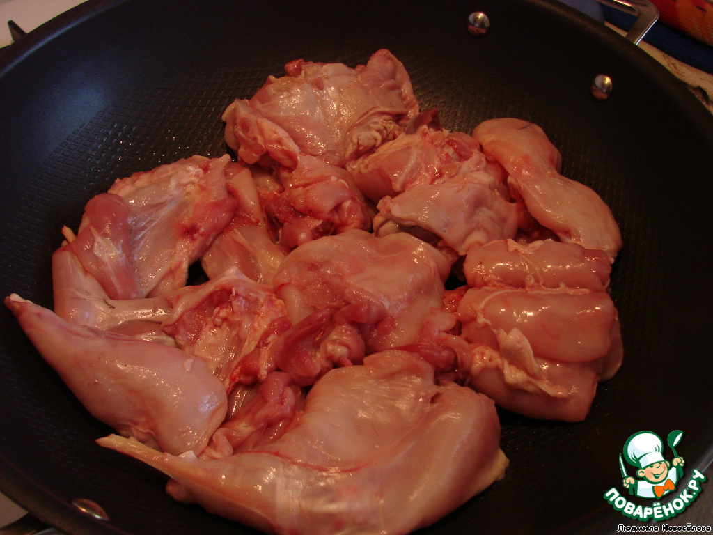 • Затем кролика салфеткой обсушить, разделать на порционные куски и обжарить на растительном масле. Огонь убавить и тушить на медленном огне под крышкой.