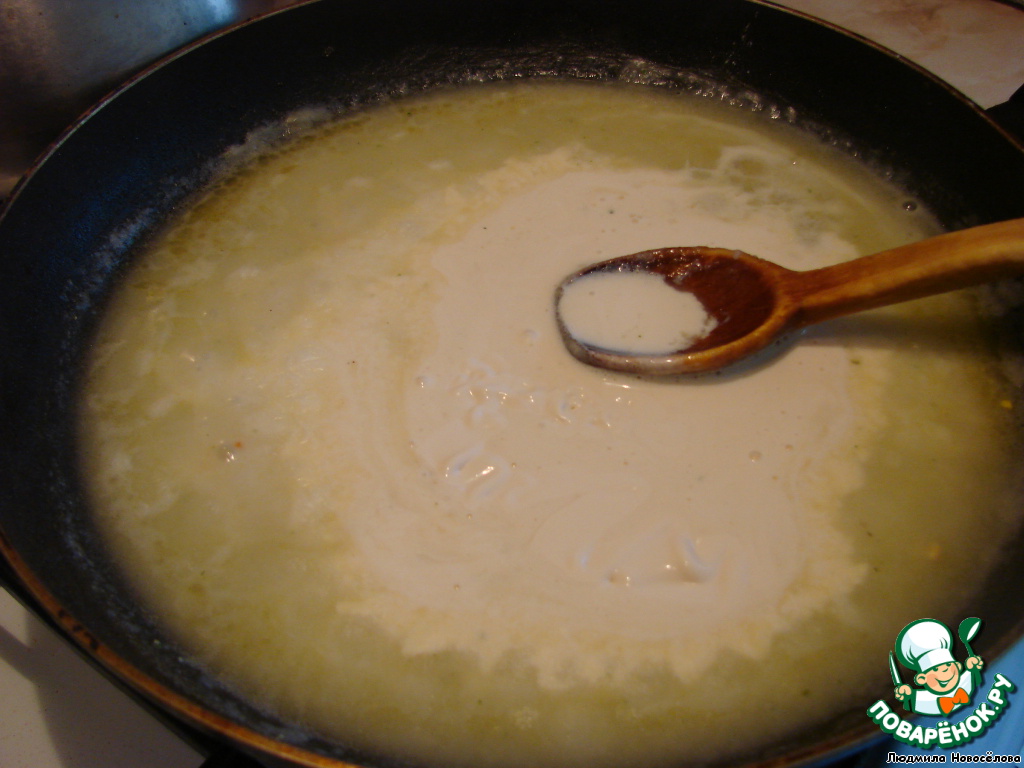 На сковороде растопить сливочное масло, добавить муки и, непрерывно помешивая, вливать горячую воду, чтобы получилась консистенция жидкой сметаны, дать потомиться и добавить сметану, лимонный сок и приправу Вегетта.