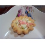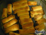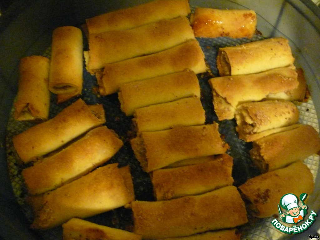 Намазать квадратики начинкой и завернуть в виде рулетов. Запекать 30-35 мин. при 180С. Если форма не силиконовая, предварительно смазать ее маслом.