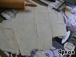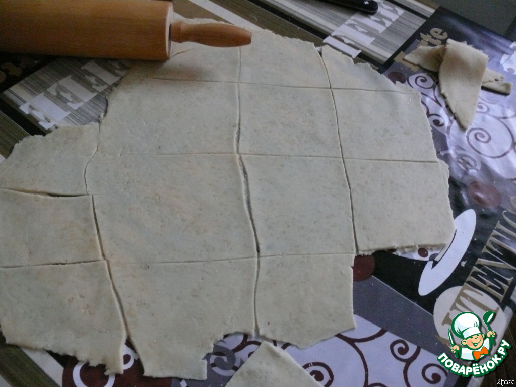 Смешать сметану, соль и 1,5 ст. л. растопленного сливочного масла. Добавляя муку, замесить густое тесто. Раскатать его в тонкий пласт (ну оочень туго катается) и разрезать на квадратики.