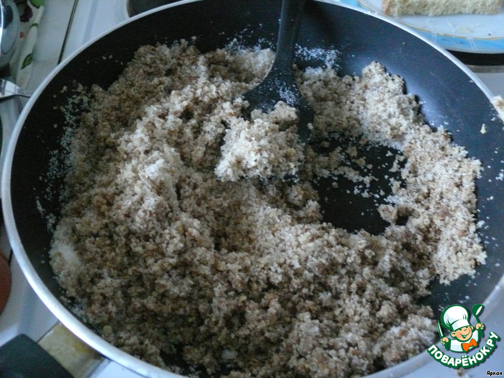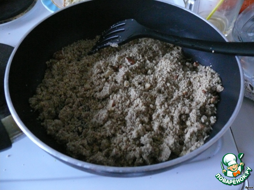 Приготовить начинку. Для этого перемолоть орехи, обжарить их на сухой сковороде. Затем добавить оставшееся масло и подождать, пока оно распустится.