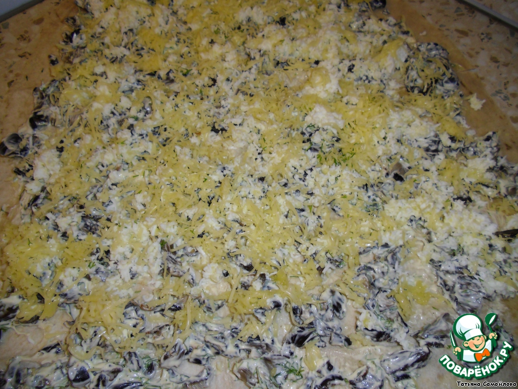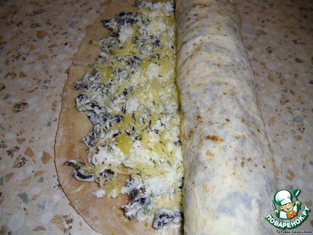 На лист лаваша выкладываем опята, смешанные с майонезом и укропом.
