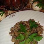 ... с гречневой кашей. Честное слово, такую гречку даже неудобно кашей обзывать; получилось что-то вкусно-воздушное: каждое зернышко распарилось, пропиталось ароматом грибов и сельдерея, но в однородную кашу все это не превратилось. Вобщем, вкусно! особенно понравится любителям сельдерея...