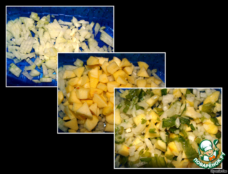 Яблоко очистить от кожуры и семенной камеры, нарезать кубиками, смешать с луком и петрушкой.