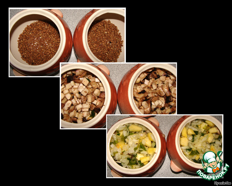 • На дно горшочков насыпать по 2 ст. л. промытой гречки,