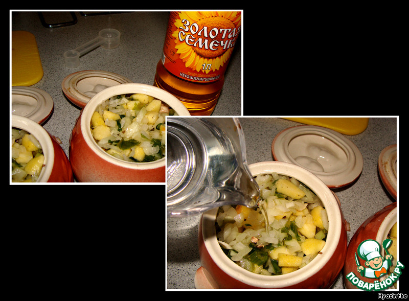 • В каждый горшочек влить по 1 ст. л. растительного масла (мне нравится нерафинированное, но это по желанию),