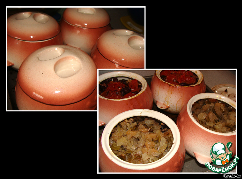 накрыть горшочки крышками и поставить в слегка разогретую духовку.