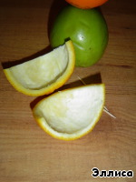 Апельсин разрезаем на две части, одну откладываем, а вторую половину режем пополам, убираем мякоть.