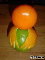 ниже центра мандарина делаем небольшое отверстие и в него вставляем эти треугольники, тем самым получая клюв. -